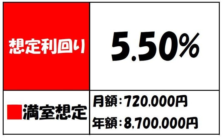 | 収益情報 | 表面利回り:5.50% 家賃収入:8,700,000円 |